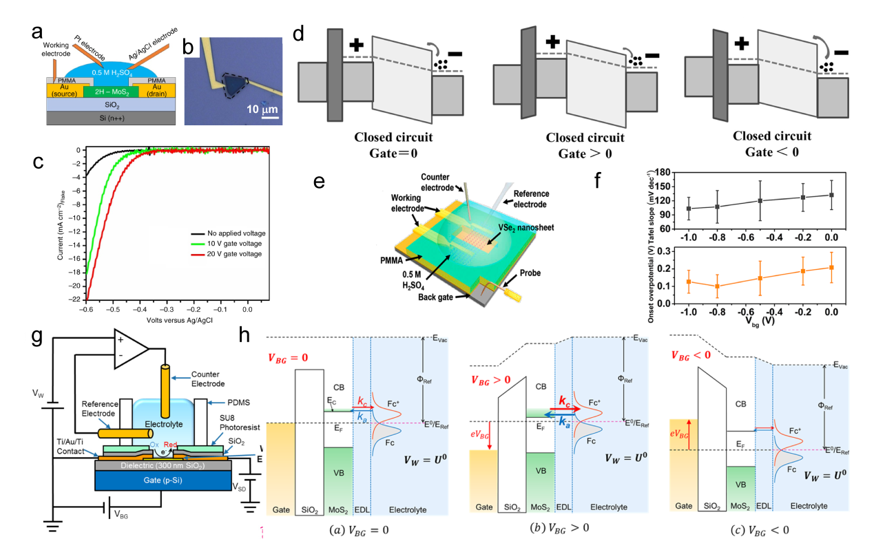 Figure 7. (a) Schematic of the gate-modulation electrochemical device. (b) Optical images of 2H-MoS2 with Au pads. (c) LSV of gate-dependent HER measurements, the green and red curves show the improvement in electrocatalytic activity after applying a positive gate voltage of 10 and 20 V, respectively.[119] (d) Energy band diagrams of the MoS2 device at different gate bias.[120] Copyright 2017, Wiley-VCH Verlag GmbH & Co. (e) Schematic of the HER device under back gate voltages. (f) Statistic-based influence of the back gate on the onset overpotential and Tafel slope.[81] Copyright 2017, American Chemical Society. (g) Schematic of a back-gated electrochemical cell. (h) Energy band diagrams of the MoS2 at various back-gate biases.[67] Copyright 2017, American Chemical Society. |