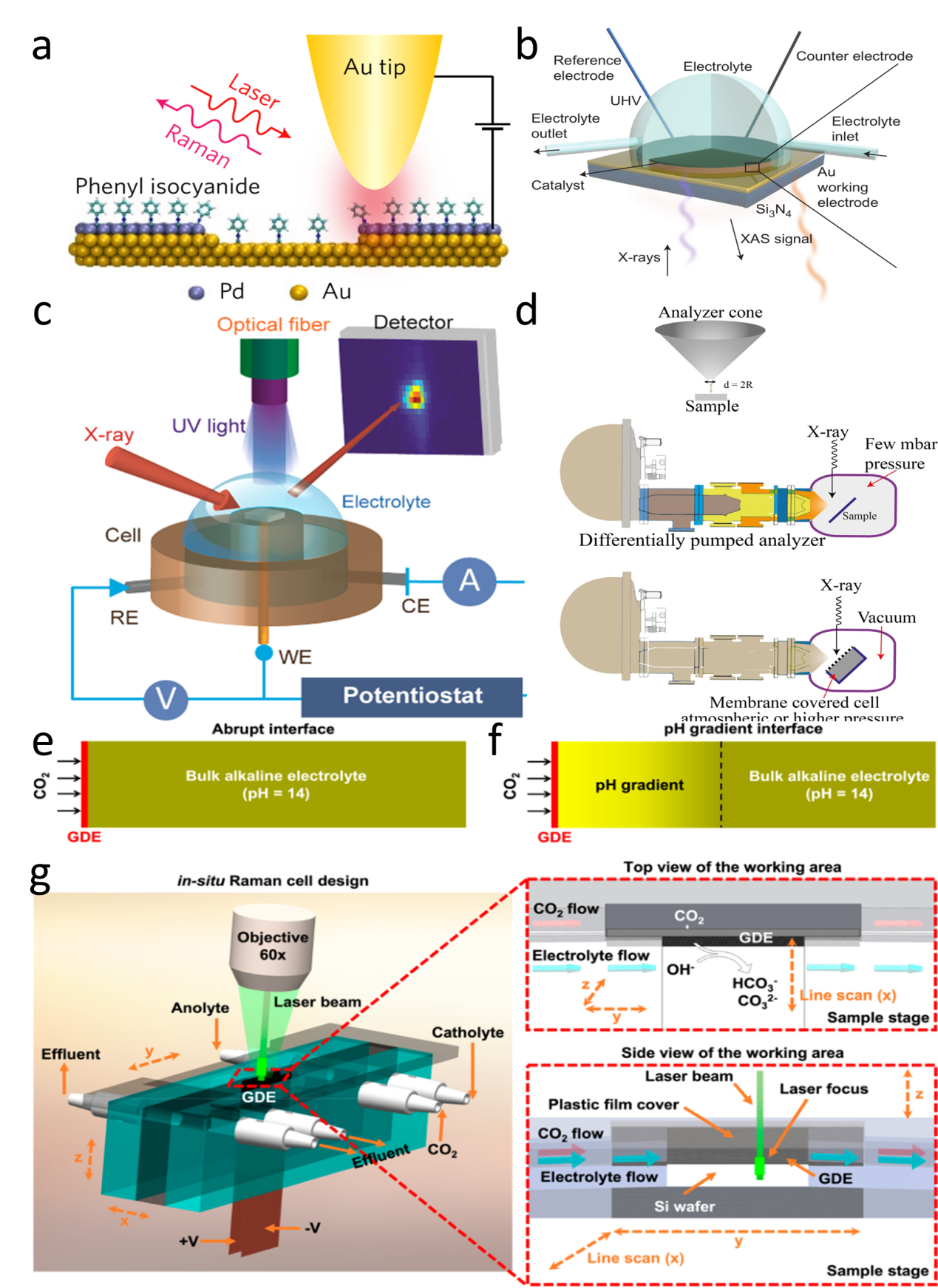 Figure 9. (a) Schematic of an STM-based time-dependent tip-enhanced Raman spectroscopy (TERS).[140] Copyright 2016, Nature Publishing Group. (b) Schematic illustration of the in situ XAS liquid cell.[142] Copyright 2018, Nature Publishing Group. (c) Schematic of the experimental setup for operando X-ray reflectivity of SrTiO3.[141] Copyright 2016, American Chemical Society. (d) Schematic illustration of the in situ XPS experimental set-up.[143] Copyright 2018, Wiley-VCH Verlag GmbH & Co. Designed flow cell for performing in situ Raman measurements to distinguish between (e) an abrupt interface and (f) a gradient interface. (g) The cell design with both top and side views of the cathode area.[144] Copyright 2020, American Chemical Society. |