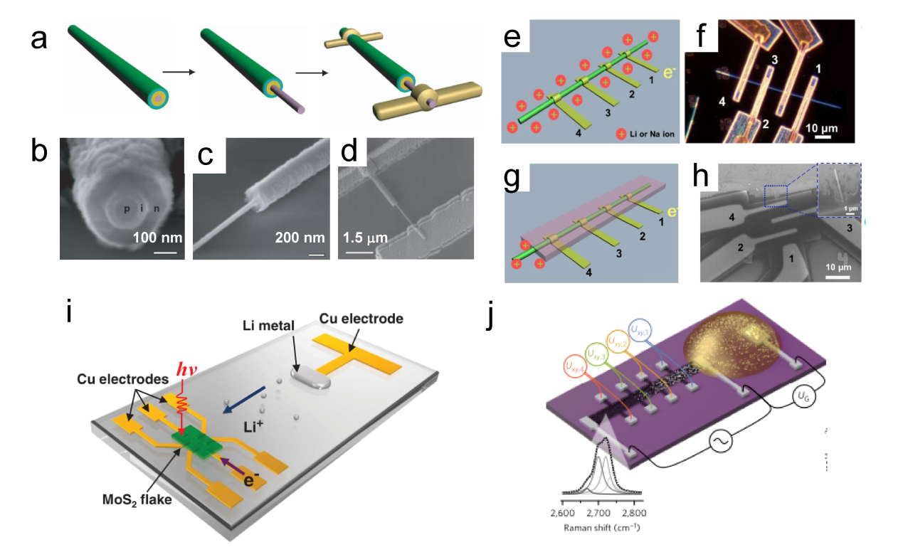 Figure 12. (a) Schematics of fabrication process of the single nanowire photovoltaic device. (b, c, d) SEM images corresponding to schematics in a.[91] Copyright 2007, Nature Publishing Group. (e, f) The schematics and dark field optical microscopic image of the nanowire electrode. (g) The second configuration, in which the nanowire is covered by a passivation layer with only one exposed end. (h) The SEM image of the device with the second configuration.[79] Copyright 2015, American Chemical Society. (i) Schematic of MoS2-Li microbattery.[180] Copyright 2015, Wiley-VCH Verlag GmbH & Co. (j) Schematic of the device for lithium ion diffusion in bilayer graphene. The inset shows the Raman scattering response of bilayer graphene.[181] Copyright 2017, Nature Publishing Group. |