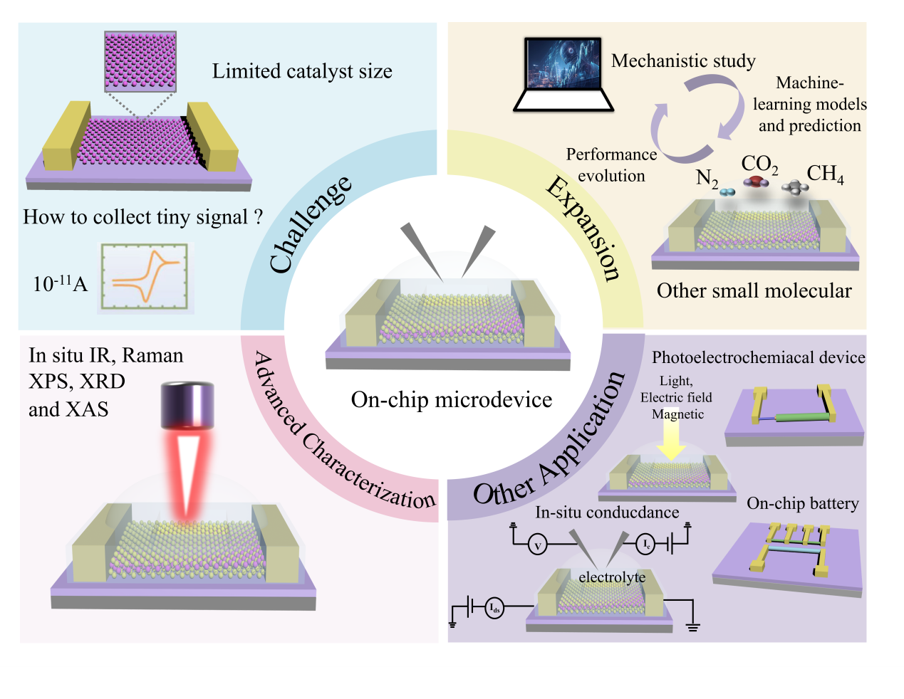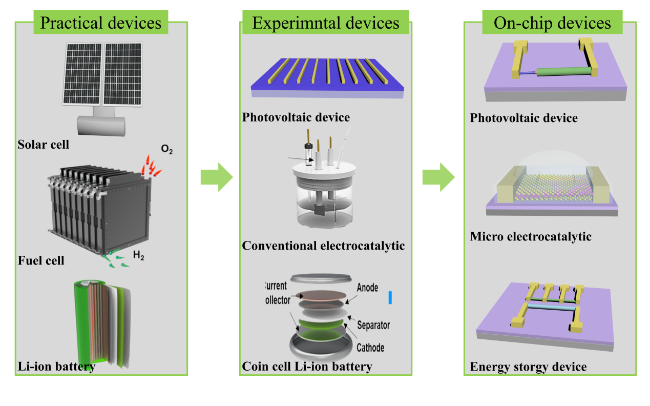 Figure 15. Prospects for on-chip microcells. The challenges in this emergent field, such as limited catalyst size. The applications of the on-chip microcells, e.g., the expansion, other application and advanced characterization are expected. |