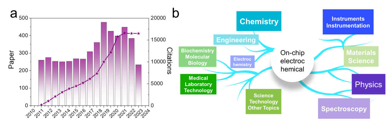 Figure. 2 (a) Annual number of publications by using keyword of “on-chip electrocatalysis” from Web of Science on January 7, 2025. (b) The hot spot in the total circulation. |