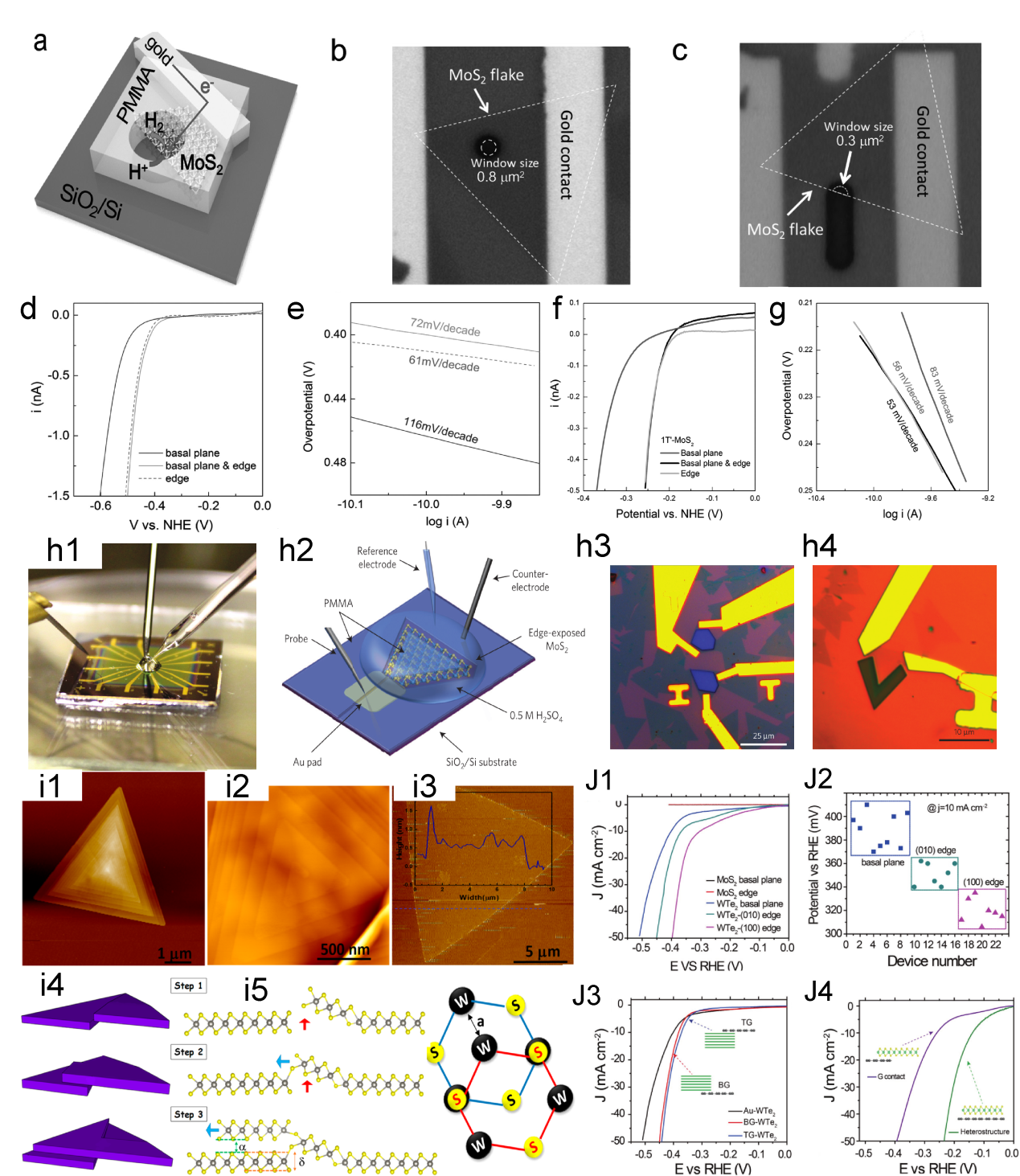 Figure 4. (a) Schematic of the on-chip setup. Optical image of a MoS2 showing the (b) basal and (c) edge planes. (d) LSV and (e) Tafel plots of the MoS2 with basal plane and edge, the electrolyte was argon-purged in 0.5 M H2SO4 and scan rate was set at 10 mV s−1. (f) LSV and (g) Tafel curves of monolayer 1T′-MoS2 basal plane, and edge in HER.[64] Copyright 2017, Wiley-VCH Verlag GmbH & Co. (h1) Photograph of the electrochemical microcell. (h2) Schematic of the on-chip electrocatalytic. Optical microscope images of single-layer MoS2 with (h3) the basal and (h4) edge exposed.[80] Copyright 2016, Nature Publishing Group. (i1, i2) AFM of spiral WS2 domains and (i3) corresponding height of monolayer WS2. (i4) Schematic of the spiral domain growth modes. (i5) Schematic of the atomic arrangement in spiral WS2.[104] Copyright 2019, American Chemical Society. (j1) LSV of MoS2 and WTe2 with different exposed area, the overpotential of (100), (010) edge and basal plane is 320 ± 10 mV, 350 ± 10 mV and 390 ± 20 mV respectively at 10 mA cm−2. (j2) Summary of the overpotentials for WTe2 with different exposed sites. (j3) LSV of WTe2 with basal plane. (j4) LSV of MoS2 with a graphene contact, as well as from the MoS2/graphene heterostructure.[105] Copyright 2018, Wiley-VCH Verlag GmbH & Co. |