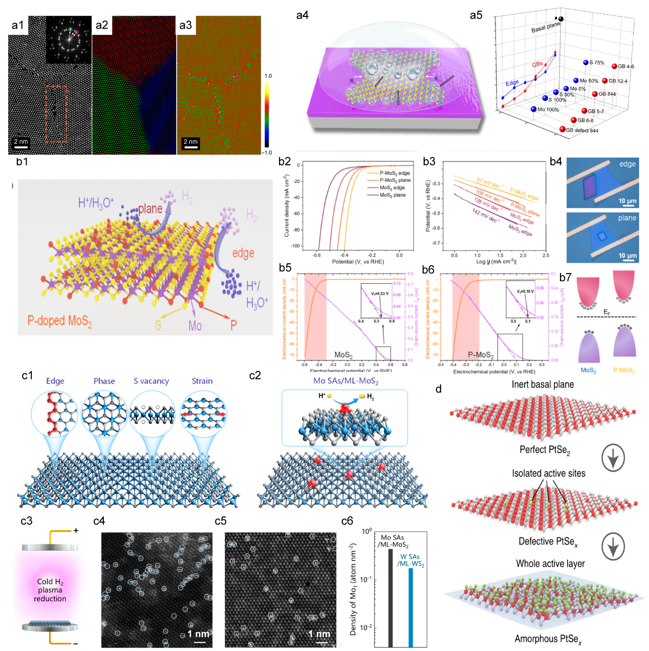 Figure 6. (a1) The HAADF STEM image of the GBs between three MoS2 grains, the inset on the left shows the Fourier transform. (a2) The composite color-coded inverse fast Fourier transform (IFFT) image. (a3) illustrates the Geometrical Phase Analysis (GPA) routine.[112] (b1) Schematic of HER process on P-MoS2 nanosheets. (b2) and (b3) show the LSV and Tafel plots for the MoS2 and P-MoS2, The edge sites show an onset potential (η10) of 297 mV and a Tafel slope of 97 mV dec−1 for HER, exceeding those of the basal plane with 328 mV and 108 mV dec−1. (b4) Optical images of edge and basal plane on a P-MoS2. (b5) and (b6) display the electrochemical and electronic signals of a MoS2 and P-MoS2 during the HER. (b7) Illustrates the electronic structure of P-MoS2, aligning the Fermi levels.[113] Copyright 2017, American Chemical Society. (c1) Schematic of the active sites of MoS2. (c2) Schematic of Mo ML-MoS2. (c3) Details the synthesis of metal SAs on a ML-MoS2. HAADF-STEM images in panels (c4) and (c5) depict Mo SAs on ML-MoS2 and tungsten SAs on monolayer WS2 samples, respectively. (c6) statistical results on the density of Mo and W SAs on 2D monolayers.[114] Copyright 2020, American Chemical Society. (d) Schematic of the amorphous PtSex surface, perfect PtSe2 and defective PtSex.[115] Copyright 2022, Nature Publishing Group. |