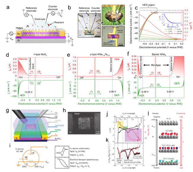Figure 8. (a) Schematic of the microcell-based in situ electronic/electrochemical measurement. (b) Optical image of the microcell. (c) Typical electrochemical (y axis in black) and electronic (y axis in red) signals of single-layer WS2 during the HER at different bias potentials. Self-gating phenomenon of (d) n-type MoS2, (e) p-type WSe1.8Te0.2, and (f) bipolar WSe2, typically, n-type MoS2 is turned on at a negative electrochemical potential and only delivers the HER, p-type WSe1.8Te0.2 is turned on at a positive electrochemical potential and only delivers the OER, bipolar WSe2 is turned on at both negative and positive electrochemical.[69] Copyright 2019, Nature Publishing Group. (g) Schematic of the Pt NW device. (h) SEM image of the device cell. (i) Schematic of CV and ETS for in situ monitoring of the electrochemical interfaces. (j) The IG-VG and normalized GSD-VG characteristics of a typical Pt NW device, IG-VG resembles the typical CV characteristic of a polycrystalline Pt surface, containing redox regions of HER, H adsorption/desorption region (Hupd), double layer (DL) region, surface oxide formation/reduction region (Oupd) and OER. (k) The differentiated ETS curve illustrates spectral peak characteristics. (l) Schematic of various Pt surface conditions along with the sweeping electrochemical potentials (left black axis) and the corresponding changes in conductivity.[68] |