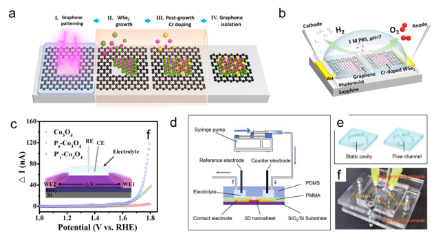 Figure 10. (a) Schematic of the formation process of the Cr-WSe2/graphene heterojunction. (b) Schematic of the on-chip electrocatalytic device.[85] Copyright 2022, American Chemical Society. (c) In situ I-V measurements of individual Co3O4, P0-Co3O4 and P-Co3O4 thin-films. Inset: The schematic of in situ I-V measurements. The applied potentials in WE1 and WE2 (called V1 and V2) increase synchronously vs. RHE, from 1 to 1.8 V, and keep the constant tiny potential difference ΔV (ΔV=1 mV).[159] Copyright 2021, Elsevier Ltd. All rights reserved. (d) On-chip electrochemical measurement setup for the ORR. (e) Schematic illustration of the setup. (f) Schematic diagram of the static and microfluidic PDMS cells.[84] Copyright 2022, Wiley-VCH Verlag GmbH & Co. |