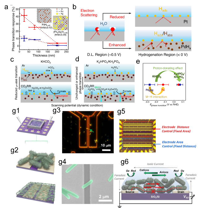 Figure 11. (a) The relationship between the thicknesses of Pd and Pd4Ag nanowire films and their phase transition responses (ΔRMHx) is illustrated on the ETS. (b) Schematic of electron scattering in metals with surface adsorbates and hydrides. A schematic of the different Pd-H states in (c) KHCO3 and (d) K2HPO4/KH2PO4 and the corresponding CO2RR processes at the interfaces. (e) Summary of phase transition potentials of Pd and Pd4Ag under CO2RR conditions in KHCO3 and K2HPO4/KH2PO4 obtained at 10 mV/s.[172] (g1, g2) Schematic of the nanoelectronic measurement setup. (g3) Optical microscope (OM) image of MR-1 in dark-field mode. (g4) An ex situ SEM image of MR-1. (g5) Schematic of biofilm measurements. (g6) Schematic of the electrochemistry model at the interface of Shewanella oneidensis MR-1.[173] Copyright 2016, American Chemical Society. |