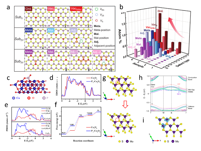 Figure 13. (a) Illustration of atomic defects observed in single-layer V-MoS2. (b) Statistical analysis of the concentration of these atomic defects.[116] Copyright 2022, Wiley-VCH Verlag GmbH & Co. (c) Structural diagram of P-Co3O4. (d) Total electronic density of states for Co3O4 and P-Co3O4. (e) Calculated PDOS of Co3O4 and P-Co3O4. (f) Calculated free energy diagram of the OER on Co3O4 and P- Co3O4.[159] Copyright 2021, Elsevier Ltd. All rights reserved. (g) The schematic of the S vacancy site created on the modeled MoS2 surface. (h) The computed band structures of the MoS2 surface with 5.5% S vacancies at various induced charge levels. (i) The charge density difference of a monolayer of MoS2 with 5.5% S vacancies.[192] Copyright 2019, American Chemical Society. |