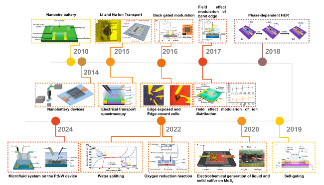 Figure. 1 Timeline for the on-chip microcell in electrocatalysis.[77] Copyright (2010) American Chemical Society; [78] Copyright (2014) Nature Publishing Group; [68, 79] Copyright (2015) American Chemical Society and Nature Publishing Group; [66, 80] Copyright (2016) American Chemical Society and Nature Publishing Group; [67, 81] Copyright (2017) American Chemical Society; [82] Copyright (2018) Nature Publishing Group; [69] Copyright (2019) Nature Publishing Group; [83] Copyright (2020) Nature Publishing Group; [84, 85] Copyright (2022) Wiley-VCH Verlag GmbH & Co and American Chemical Society; [86] Copyright (2024) Nature Publishing Group. |