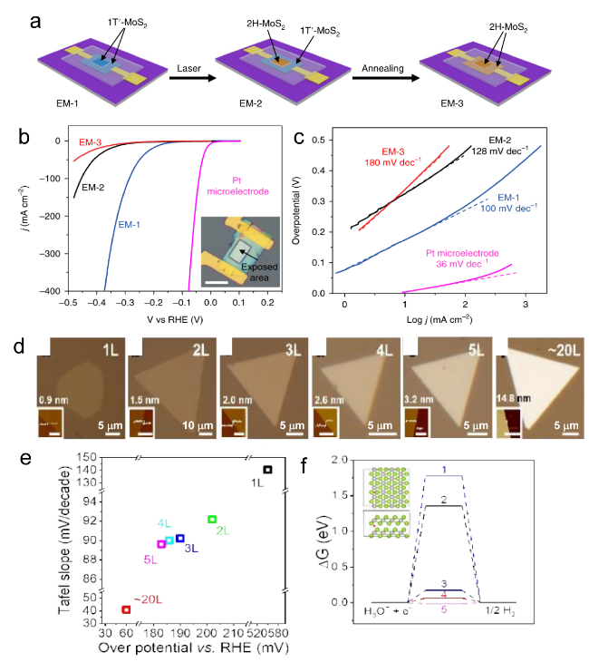 Figure 5. The diagram of fabrication process. (b) The LSV for EM-1, EM-2, and EM-3, with an inset image EM-1, the overpotential of EM-1 and EM-2 is 165 mV and 200 mV, respectively. Scale bar, 20 μm (c) Tafel plots corresponding the (b).[82] Copyright 2018, Nature Publishing Group. (d) Optical images of CVT-grown PtSe2 flakes ranging from 1 to 20 layers, insets show the corresponding AFM images. (the same height scale for AFM images, the scale bar of first is 1 μm, others is 0.5 μm) (e) LSV and Tafel slops for the HER. (f) ΔGH diagram for HER of different layer PtSe2.[106] Copyright 2019, Wiley-VCH Verlag GmbH & Co. |