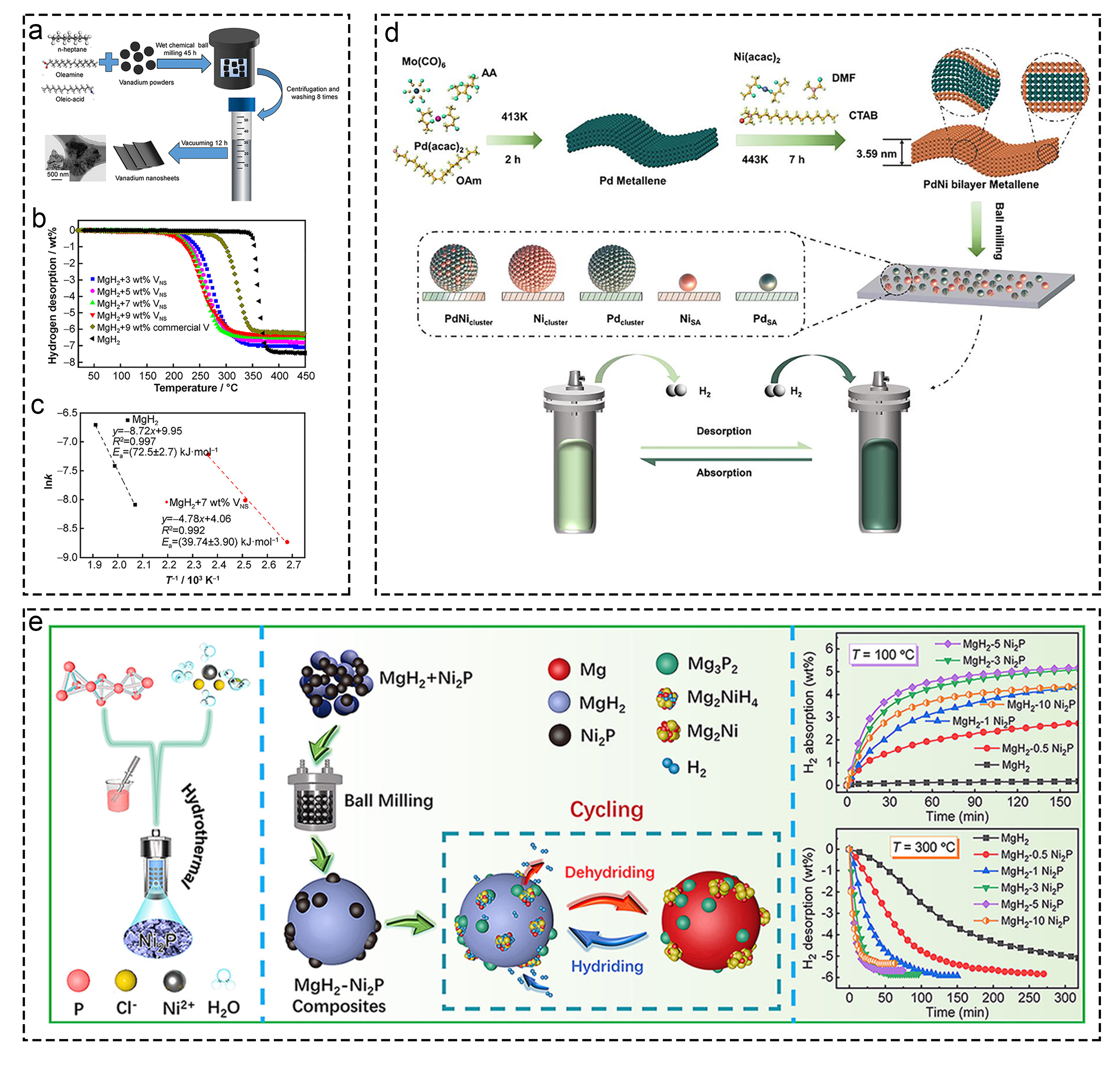 Fig. 8 Corresponding information and presentation of various catalysts on hydrogen storage of MgH2 and MgH2-based composites. (a-c) Vanadium nanosheets. Reproduced with permission [137]. Copyright 2021, Nonferrous Metals Society of China. (d) MgH2-PdNi, Reproduced with permission [138]. Copyright 2023, Wiley. (e) MgH2-Ni2P. Reproduced with permission [140]. Copyright 2022, Elsevier. |