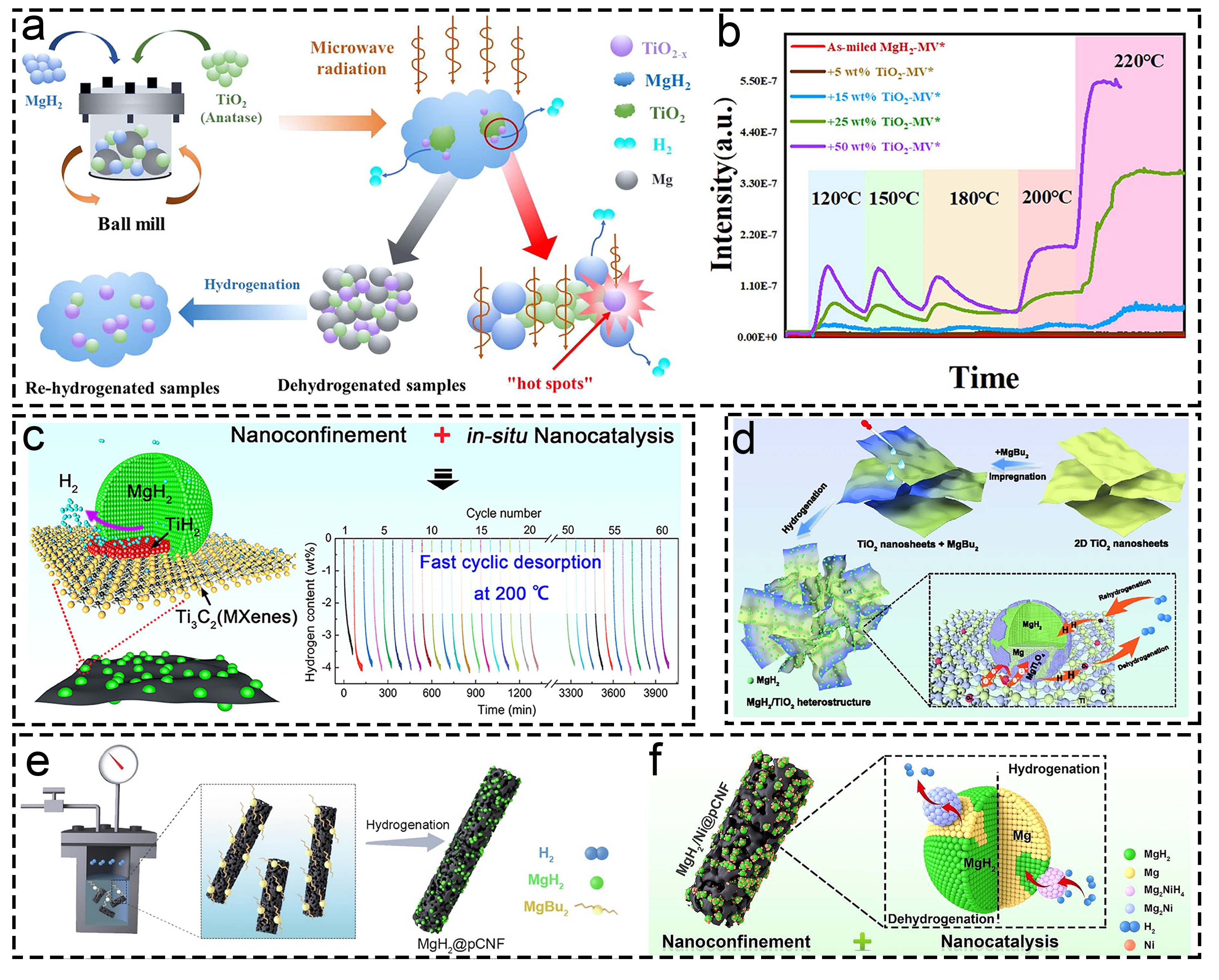 Fig. 11 Corresponding information and presentation of different catalysts on hydrogen storage of MgH2 and MgH2-based composites. (a, b) MgH2-TiO2. Reproduced with permission [190]. Copyright 2022, Elsevier. (c) MgH2@Ti-MX. Reproduced with permission [40]. Copyright 2021, American Chemical Society. (d) MgH2/TiO2. Reproduced with permission [93]. Copyright 2022, Springer. (e, f) MgH2@pCNF. Reproduced with permission [192]. Copyright 2022, Elsevier. |