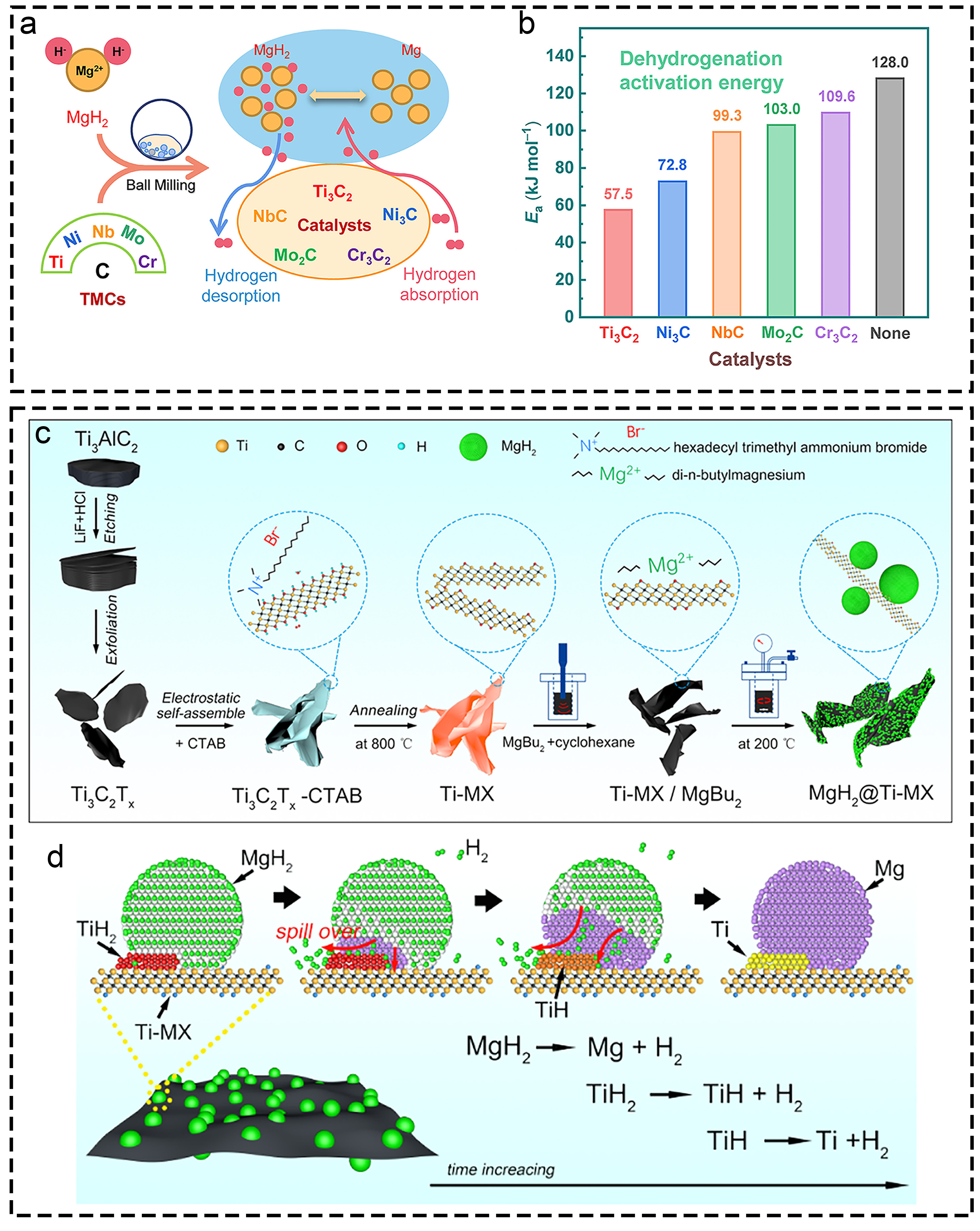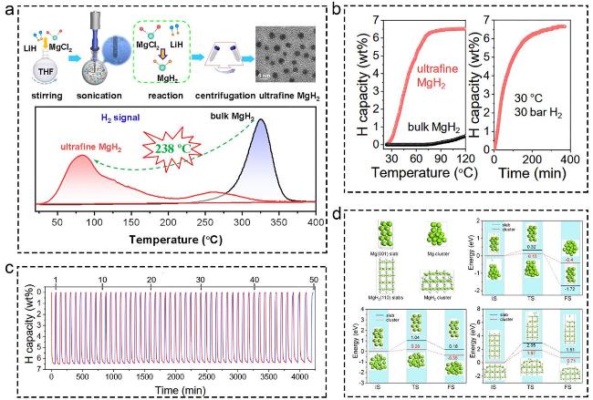 Fig. 10 (a-d) The corresponding information and presentation of ultrafine MgH2 catalysts on hydrogen storage of MgH2 and MgH2-based composites. Reproduced with permission [148]. Copyright 2020, Royal Society of Chemistry. |