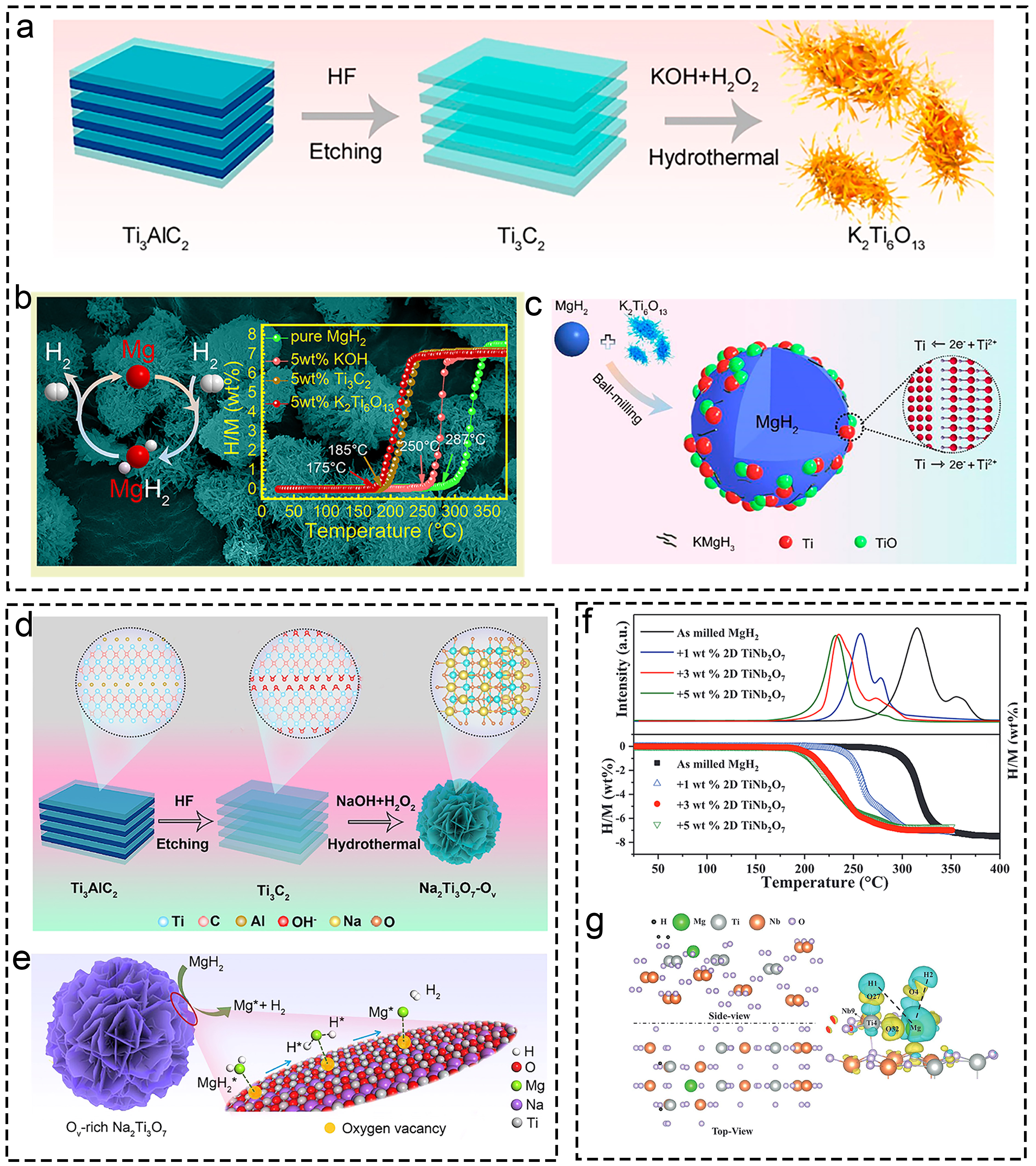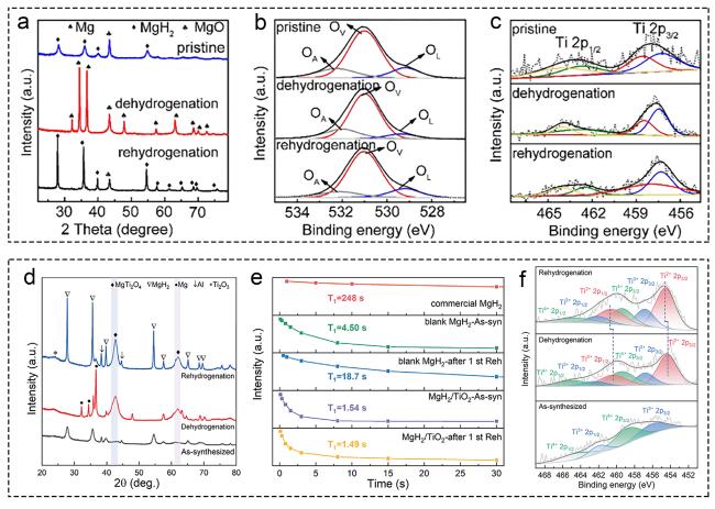 Fig. 3 Mechanism characterization and technology of Ti-based supports. (a-c) MgH2+K2Ti8O17. Reproduced with permission [91]. Copyright 2021, Elsevier. (d-f) MgH2/TiO2. Reproduced with permission [93]. Copyright 2022, Springer. |