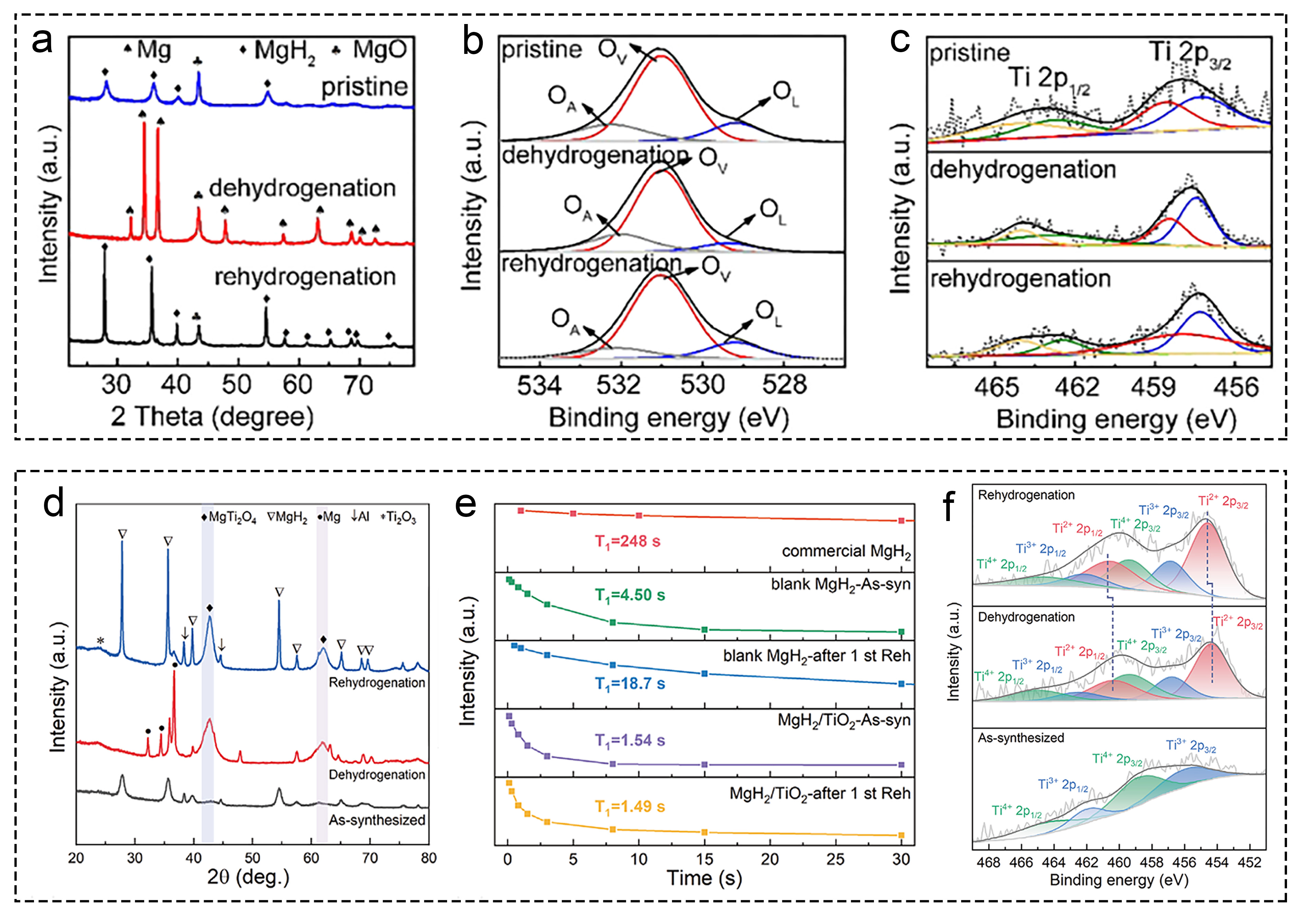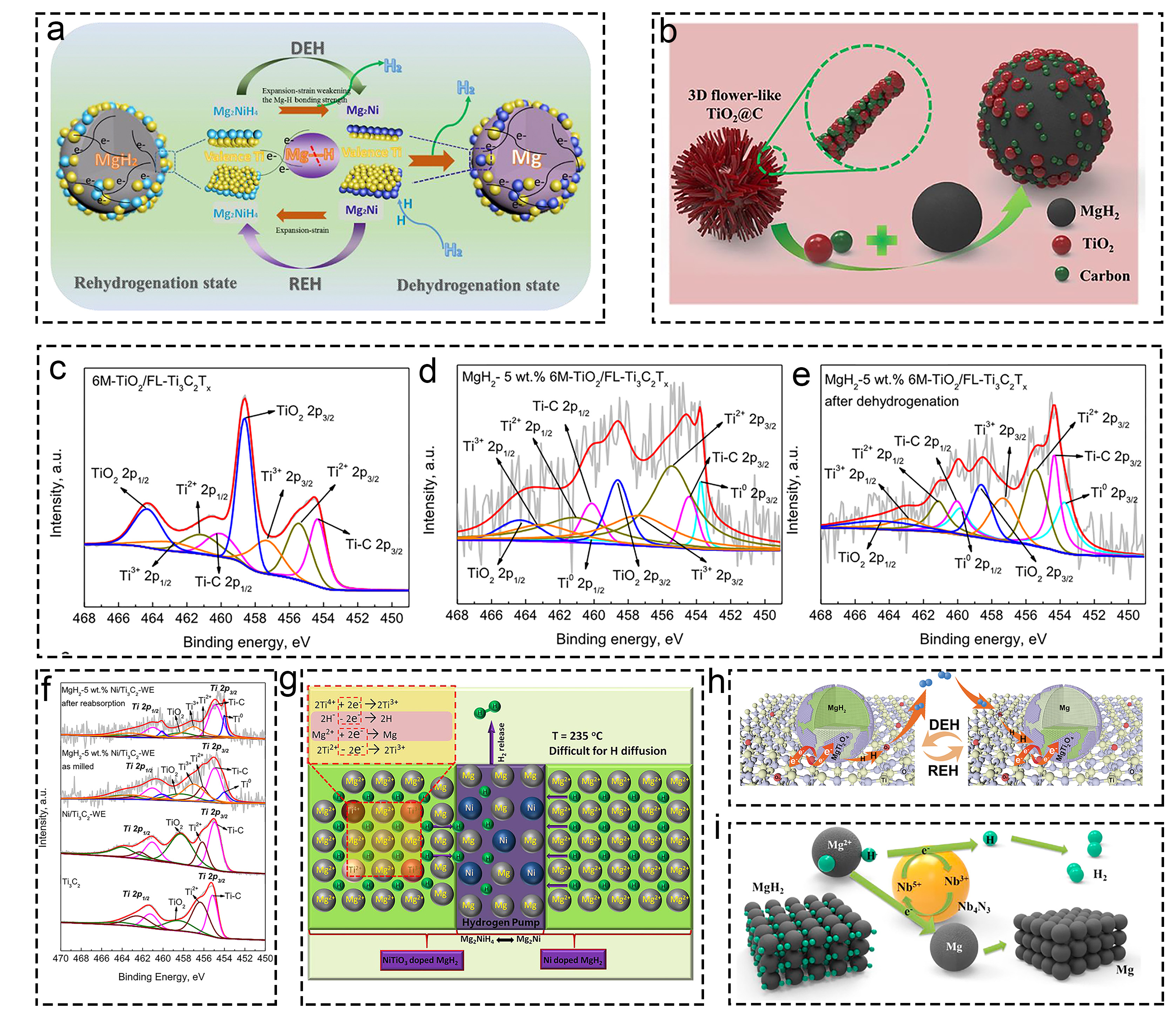 Fig. 4 Investigations on multiple valence titanium mechanism: (a) MgH2-Ni/TiO2. Reproduced with permission [95]. Copyright 2019, Elsevier. (b) MgH2+fl-TiO2@C. Reproduced with permission [96]. Copyright 2019, Elsevier. (c-e) XPS characterization of various materials before and after dehydrogenation. Reproduced with permission [97]. Copyright 2022, Elsevier. (f) Ti3C2-based MgH2 at different states. Reproduced with permission [98]. Copyright 2021, Elsevier. (g) Ti and Ni in MgH2 hydrogen storage system. Reproduced with permission [99]. Copyright 2018, American Chemical Society. (h) MgH2/TiO2. Reproduced with permission [93]. Copyright 2022, Springer. (i) NbN doped MgH2. Reproduced with permission [100]. Copyright 2020, Elsevier. |