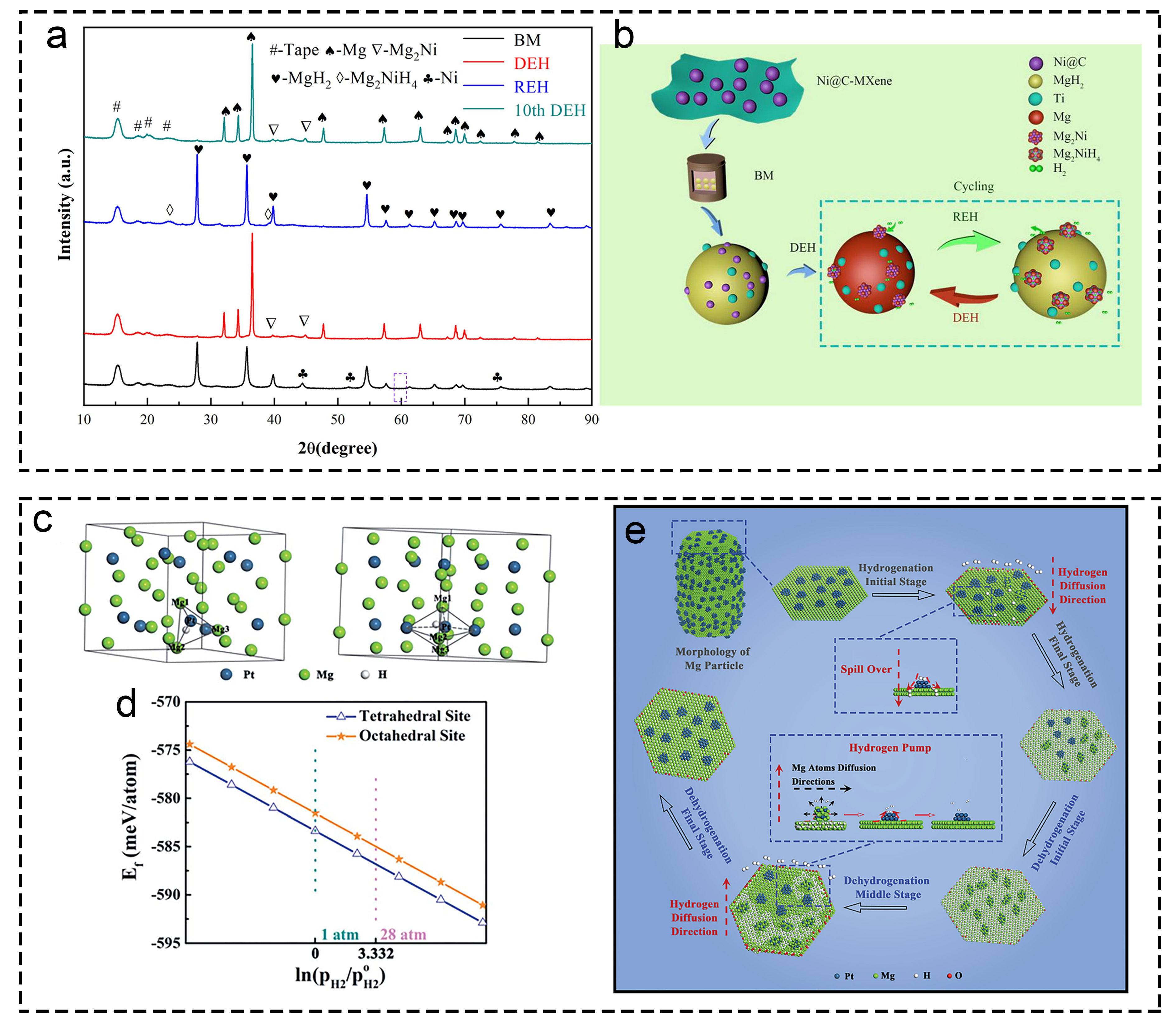 Fig. 5 Investigations on “Hydrogen pump” effect mechanism. (a, b) MgH2+10 wt.% Ni@C-MXene. Reproduced with permission [101]. Copyright 2020, Elsevier. (c-e) Mg@Pt. Reproduced with permission [102]. Copyright 2019, Royal Society of Chemistry. |