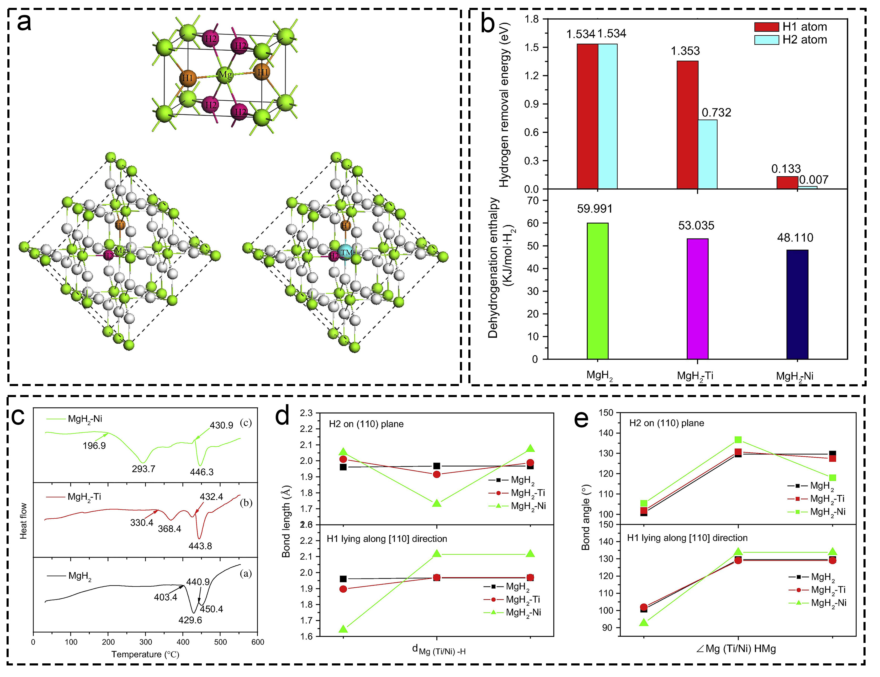 Fig. 7 Theoretical research of Ti-based additives on hydrogen storage based on experimental verification guided by DFT calculation. (a) MgH2 unit cell, Mg16H32 and Mg15TMH32 (TM = Ti or Ni). (b) Calculated dehydrogenation enthalpies and hydrogen removal energies of MgH2-based system. (c) DSC (differential scanning calorimetry) curves of MgH2-based materials. (d, e) Comparison of interatomic bond lengths and bond angles in MgH2-based system. Reproduced with permission [117]. Copyright 2015, Elsevier. |