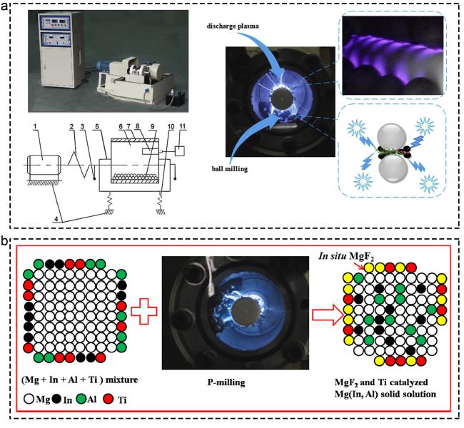 Fig. 9 Corresponding information and presentation of various catalysts on hydrogen storage of MgH2 and MgH2-based composites. (a) P-milling. Reproduced with permission [143]. Copyright 2017, Elsevier. (b) Mg85In5Al5Ti5 alloy by P-milling. Reproduced with permission [146]. Copyright 2015, Elsevier. |