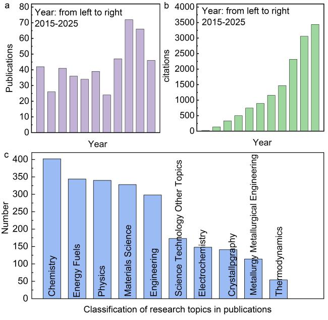 Fig. 1 (a, b) Amounts of publications and citations, (c) corresponding classification of research topics in publications using “Ti-based materials OR Ti materials OR Titanium-based composites”, “Magnesium hydrogen storage” as keywords since 2015. |