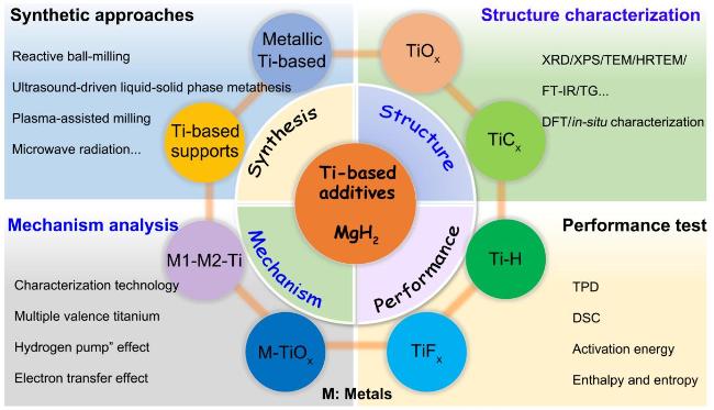 | Multiple valence titanium mechanism | Valence state changes of Ti³⁺/Ti⁴⁺ to catalyze the dissociation of H2 and transport of H⁻ | Ti compounds or precursors |