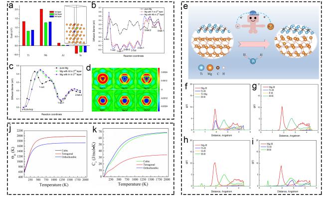 Fig. 6 Theoretical research of Ti-based additives on hydrogen storage based on pure DFT calculation. (a-d) The energy changes of Ti, Nb, Al, and In. Reproduced with permission [109]. Copyright 2017, Elsevier. (e-i) Mg-H, Ti-H and Ti-Mg bond of various structures. Reproduced with permission [111]. Copyright 2021, Elsevier. (j-k) Thermodynamic properties of TiH2 in Debye temperature and heat capacity. Reproduced with permission [112]. Copyright 2020, Wiley. |