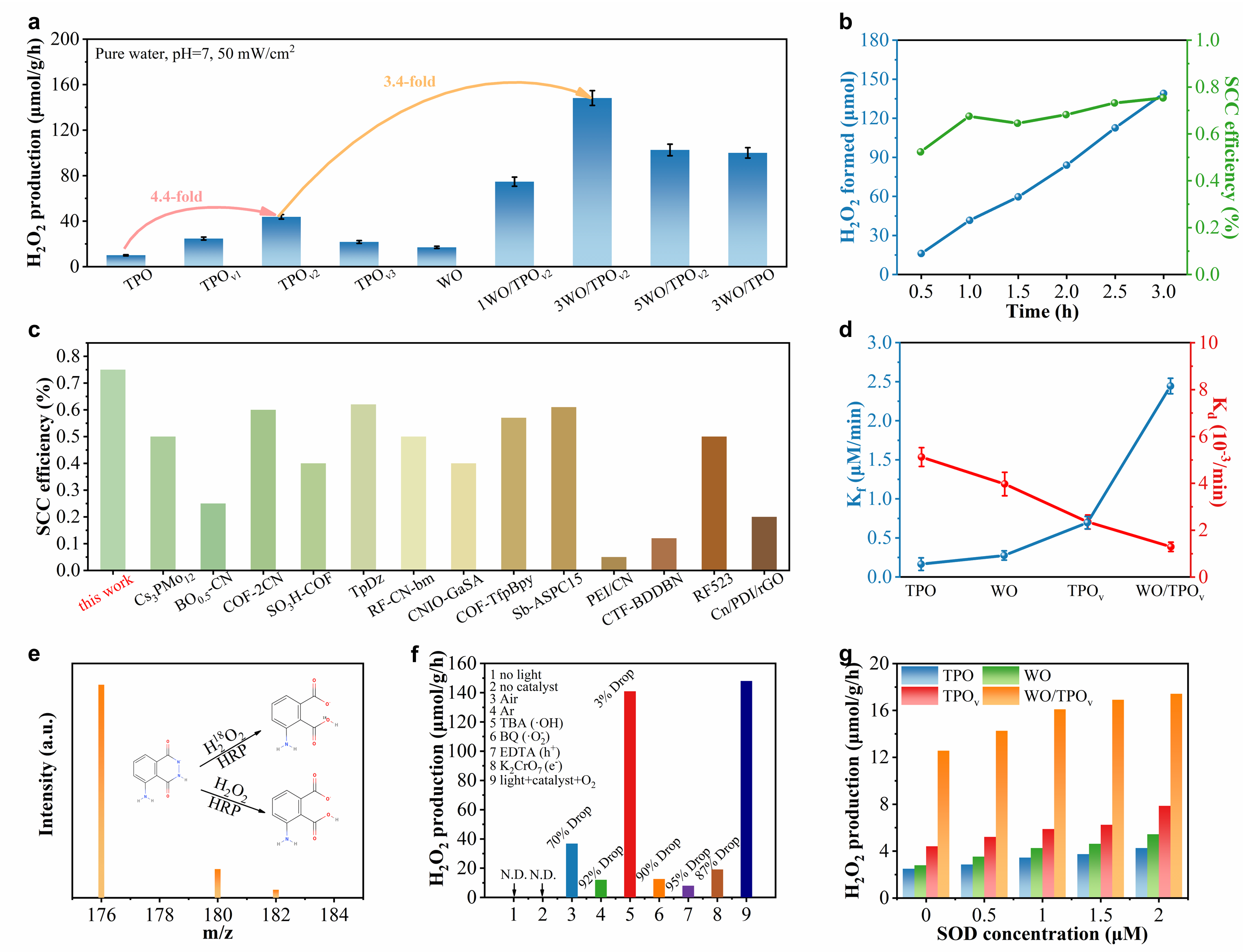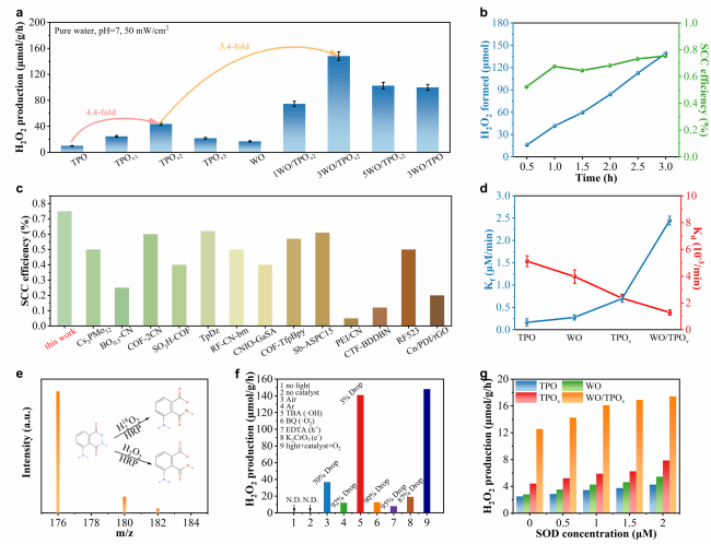 Figure 2. (a) Photocatalytic performance of different samples towards H2O2 production with pure water under light irradiation of 1h. (b) H2O2 yields and SCC efficiencies of WO/TPOv under simulated sunlight irradiation. (c) Comparison of the SCC efficiencies of WO/TPOv and relevant materials. (d) The H2O2 formation rate constant (Kf) and decomposition rate constant (Kd) corresponding to tested catalysts. (e) Mass spectra of luminol oxidized by H2O2 produced via photocatalytic reactions with H218O over WO/TPOv. (f) H2O2 generation efficiencies of the tested samples under varying gas conditions or distinct sacrificial agents under light irradiation of 1h. (g) H2O2 production rates of tested materials at varying superoxide dismutase (SOD) concentrations under light irradiation of 1h.