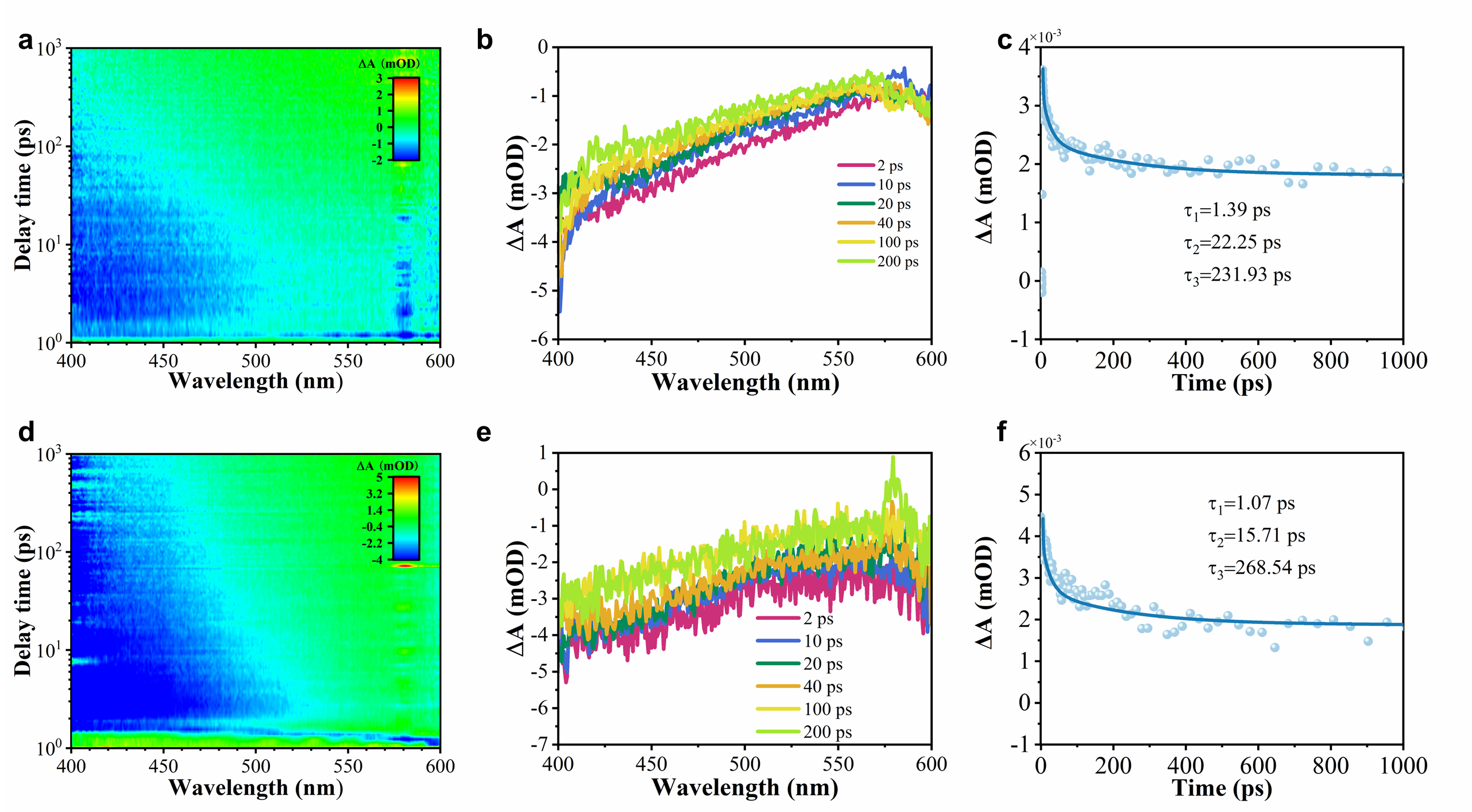 Figure 4. 2D pseudo-color maps of fs-TA spectra (a and d), transient fs-TA spectra (b and e), and kinetic time profiles (c and f) of normalized transient absorption at 400 nm, in TPOv, and WO/TPOv under 320 nm laser pulse irradiation.