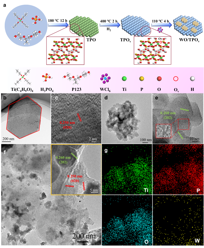 The high-magnification electron microscopy images in Figure 1b, 1c and S1 clearly show that the Ti(HPO4)2 (TPO) samples prepared by the stepwise method exhibit highly uniform micro-morphological characteristics-ordered arrangements of uniform nanosheet structures, with statistically analyzed lateral dimensions all maintained within the range of 400±20 nm. This dimensional uniformity reflects the precise controllability of the synthetic process. When the samples undergo hydrogen reduction treatment, the obtained oxygen vacancy-rich TPO (TPOv) material demonstrates excellent structural stability, as no obvious curling or collapse is observed at the edges of the nanosheets, indicating that the introduction of oxygen vacancies does not induce destruction of TPO crystalline structure. In the transmission electron microscopy image of Figure 1d-f, TPOv nanosheets are uniformly decorated with WO3 nanosheets featuring an average diameter of ~50 nm., forming a "sheet-sheet" composite structure. High-resolution TEM (Figure 1f inset) analysis reveals more detailed interfacial features: the TPOv lamellae sheet exhibit a lattice spacing of 0.250 nm (corresponding to the (020) crystal plane), while the WO3 nanosheets show lattice fringes of 0.260 nm (corresponding to the (202) crystal plane) [27,46]. In the corresponding EDX elemental mapping (Figure 1g), the yellow distribution cloud of W element highly overlaps with the green cloud of Ti element in the TPOv, further confirming the uniformity of the heterostructure. In-depth characterization data show that the introduction of oxygen vacancies has minimal impact on the intrinsic properties of TPOv all diffraction peaks in the XRD pattern (Figure S2a) perfectly match those of α-phase Ti(HPO4)2 (JCPDS No. 83-0109), confirming the complete maintenance of the crystal phase structure [27]. The DRS spectrum (Figure S3a) reveal that there is no shift in its absorption threshold, almost identical to that of the original TPO, indicating that the optical bandgap is basically stable. For the WO/TPOv composite material, although no characteristic diffraction peaks of WO3 are observed in the XRD (Figure S2b) (attributed to its low loading < 5wt%), the XRD pattern of the separately prepared WO3 sample matches with the monoclinic standard card (JCPDS No.83-0950), and the optical absorption edge (Figure S3b) also highly coincides with the theoretical value [46,47]. Comprehensive characterization results show that this synthetic strategy successfully achieves the regulation of oxygen vacancy concentration through hydrogen reduction and the construction of uniformly distributed WO3 nanosheets on the surface of lamellae using in-situ hydrothermal method without destroying the intrinsic crystal structure and optical properties of TPO. The formed heterostructure has both interfacial matching and functional synergy, providing an ideal material model for applications in photocatalysis and other fields.