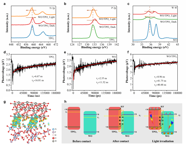 Figure 3. XPS spectra of (a) Ti 2p and (b) P 2p for TPOv and WO/TPOv, and (c) W 4f for WO and WO/TPOv. TPV spectra corresponding to (d) TPOv2, (e) WO, and (f) 3WO/TPOv2. (g) Electron density differences for WO/TPOv heterojunction. (h) The formation of advantage sample S-scheme heterojunction, and the proposed charge transfer and separation mechanism.