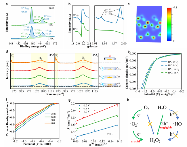 Figure 5. (a) XPS spectra of Ti 2p and (b) EPR spectra of TPO and TPOv. (c) Local charge density map of TPOv. (d) In-situ Raman spectra and (e) electrochemical reduction curves in different atmosphere of TPO and TPOv. (f) The Linear-sweep voltammograms signal of WO/TPOv catalyst measured on a rotating disk electrode at different rotation speeds. (g) K-L plots of WO/TPOv catalyst at constant electrode potentials. (h) Validated pathways for photocatalytic H2O2 production.