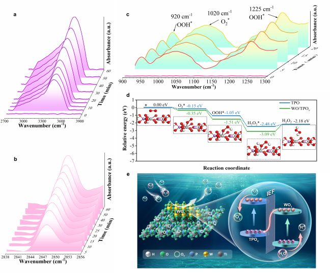 Figure 6. In-situ DRIFTS of (a) H2O adsorption, (b) H2O2 production and (c) H2O conversion on WO/TPOv catalyst. (d) Free energy diagrams for H2O2 production processes over WO/TPOv catalyst with optimized configurations for each step. (e) Schematic of the S-scheme mechanism and H2O2 photosynthesis reaction involved in WO/TPOv catalyst.