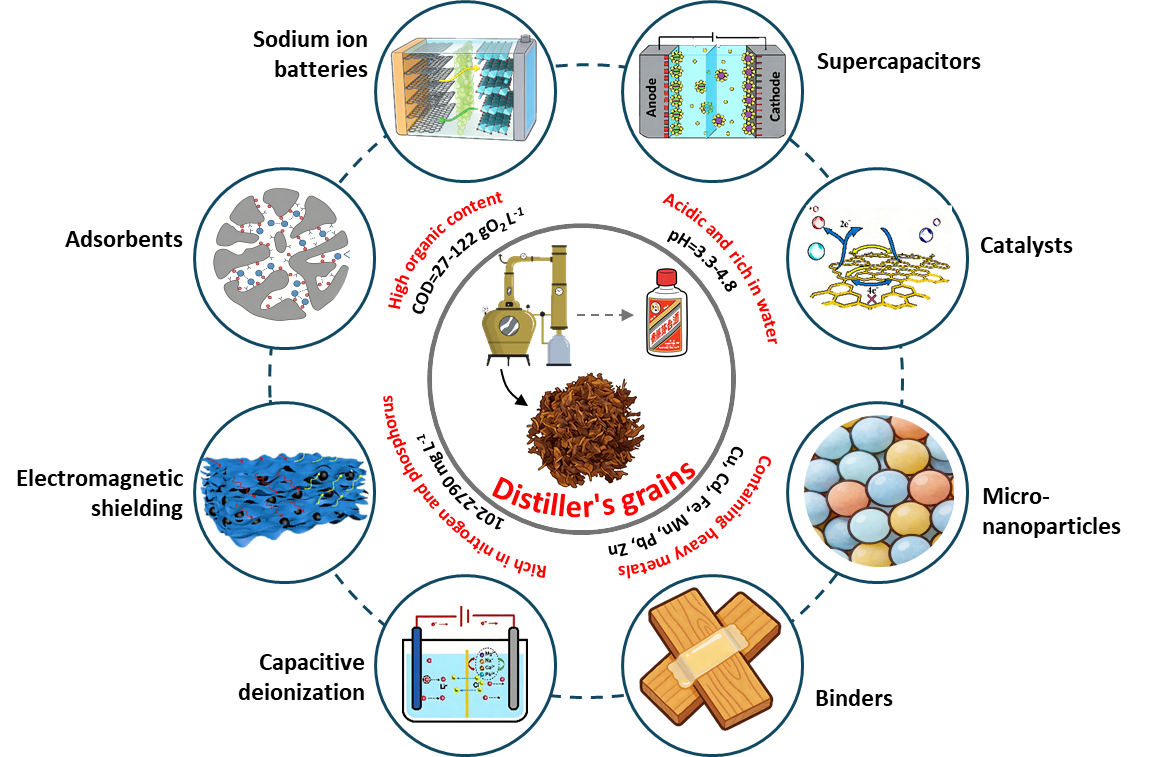 Baijiu, a traditional Chinese spirit integral to the cultural heritage, has Moutai and Wuliangye as its most prominent global exemplars. Distiller's grains, a typical byproduct of the Chinese Baijiu industry, have gained increasing prominence as a renewable biomass resource. However, the common practices of discarding distiller's grains or utilizing them in low-value applications result in significant resource waste and serious environmental pollution. The preparation of functional materials and composite functional materials from distiller's grains for high-value utilizations is currently in the early exploration stage. This review critically summarizes recent advances in functional and composite functional materials derived from distiller's grains for applications in sodium-ion batteries, electrochemical supercapacitors, environmental adsorbents, heterogeneous catalysts, and other emerging energy and sustainability-related fields. This work outlines high-value development directions for distiller's grains-derived functional materials, focusing on their practical industrial applications. Finally, four key challenges, including component heterogeneity, process specificity, application prospects, and large-scale application, were proposed for the future development of functional materials and composite functional materials from distillers' grains. The detailed future development direction is pointed out for addressing these challenges, aiming to promote the upgrading of the Chinese Baijiu industry and the vigorous development of the China's economy of new quality productive forces.